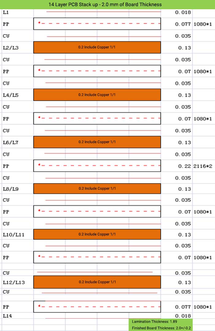14 Layer PCB Stack up – 2.0 mm of Board Thickness