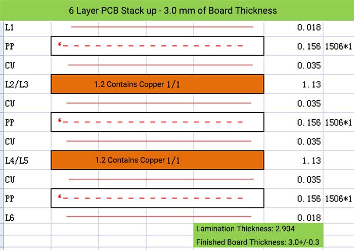 6 Layer PCB Stack up – 3.0 mm of Board Thickness