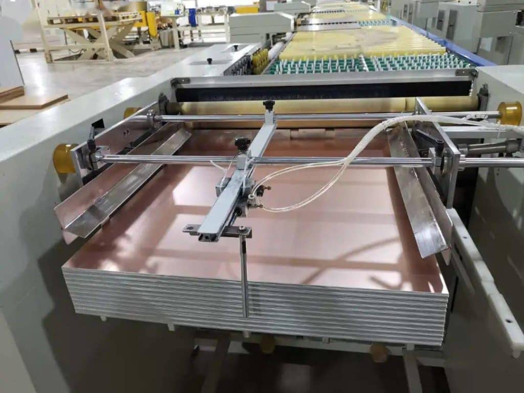Let’s go through the entire paneling process using the example of a 49×82 inch copper foil board being cut into 690x620mm boards. On the right side of the conveyor belt in Figure 2, you can see a stack of copper foil boards waiting to be cut. At the top of the conveyor belt, you can see a copper foil board being placed onto the belt. The picking tool uses suction cups because the copper foil board surface is smooth.
